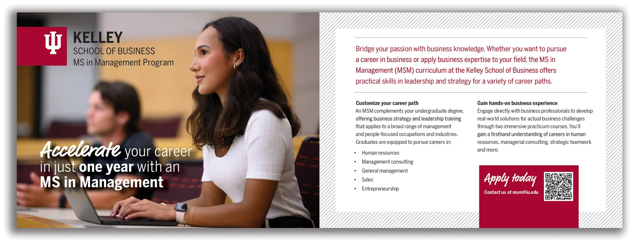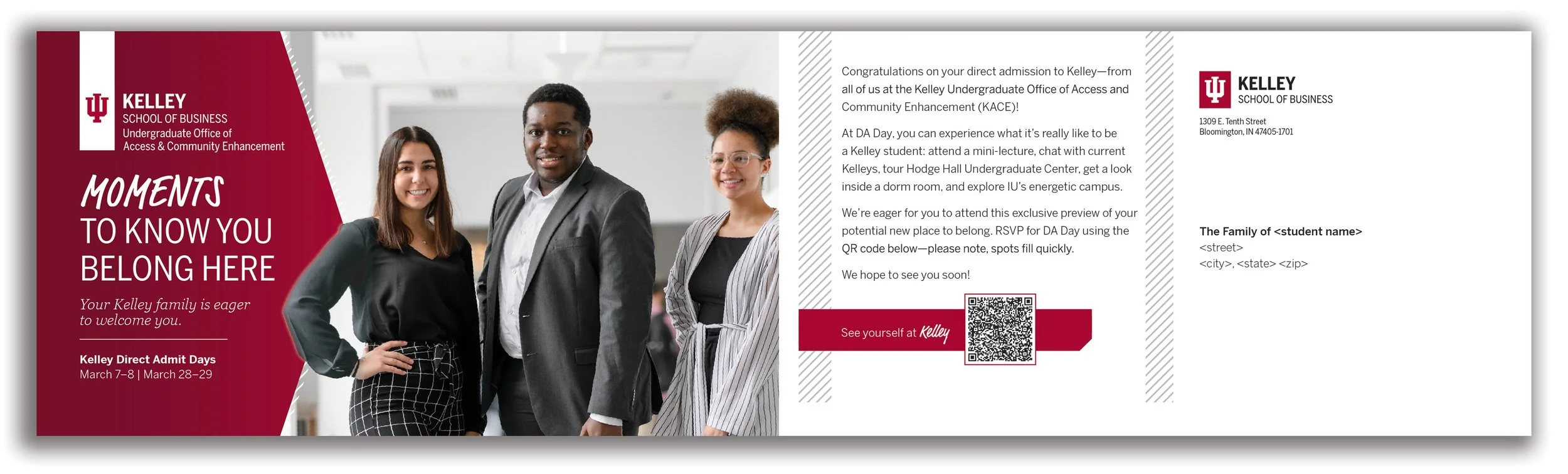 I get many postcard requests in the many departments of the Kelley School of Business. They are a great way to reach audiences like parents who are at home or students away from campus for the holidays. Events and program signups often require advanced consideration so the sooner and more often the audience can be notified the better chance they have to consider and prepare.